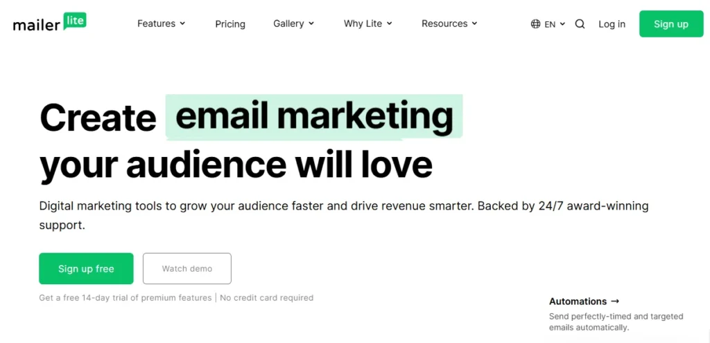 MailerLite also includes built-in signup forms, pop-ups, landing pages, and even a mini website builder, giving you everything you need to capture leads and grow your list.
